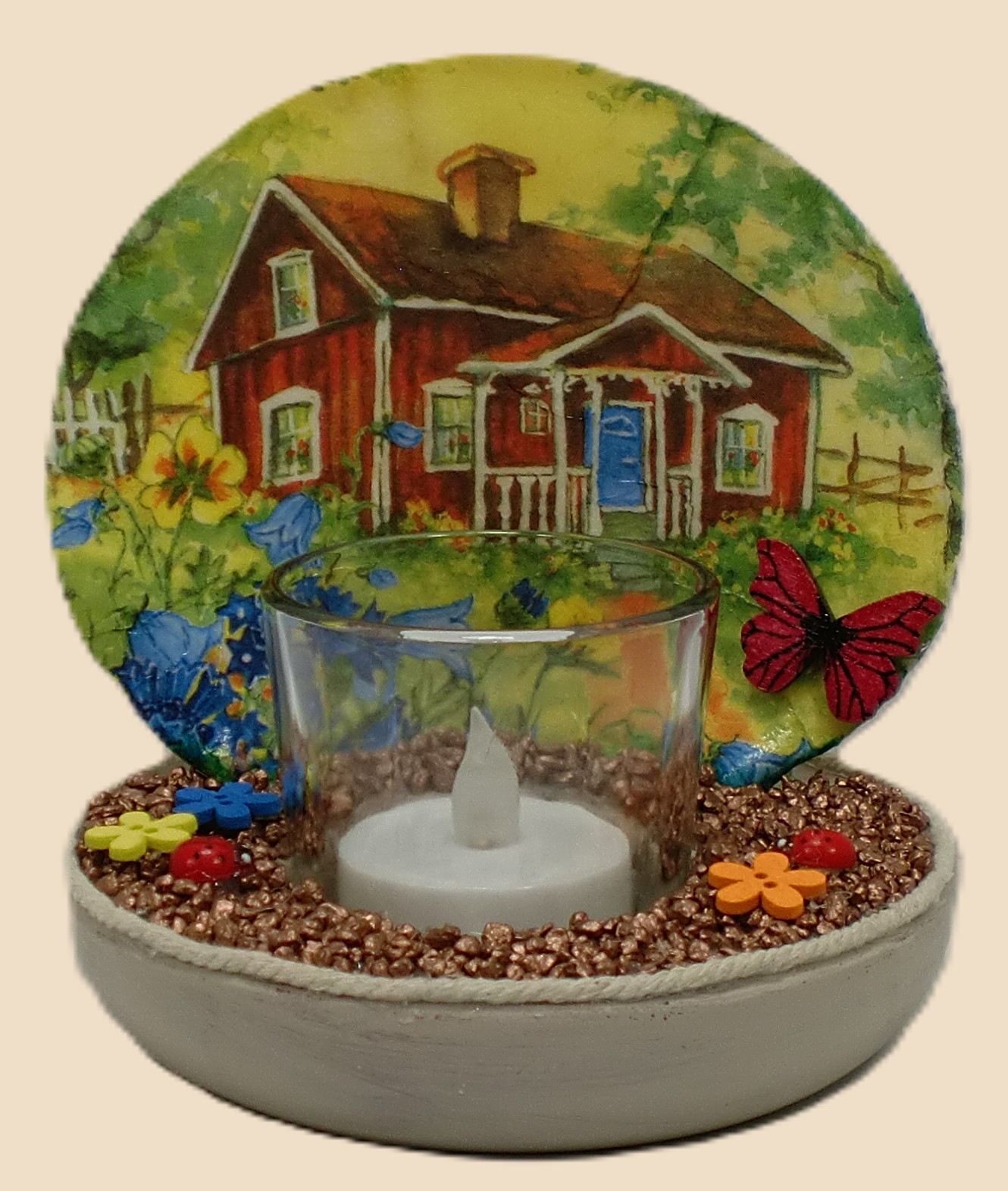 En ljusstake gjuten i gips med decoupage, och diverse dekorationer.