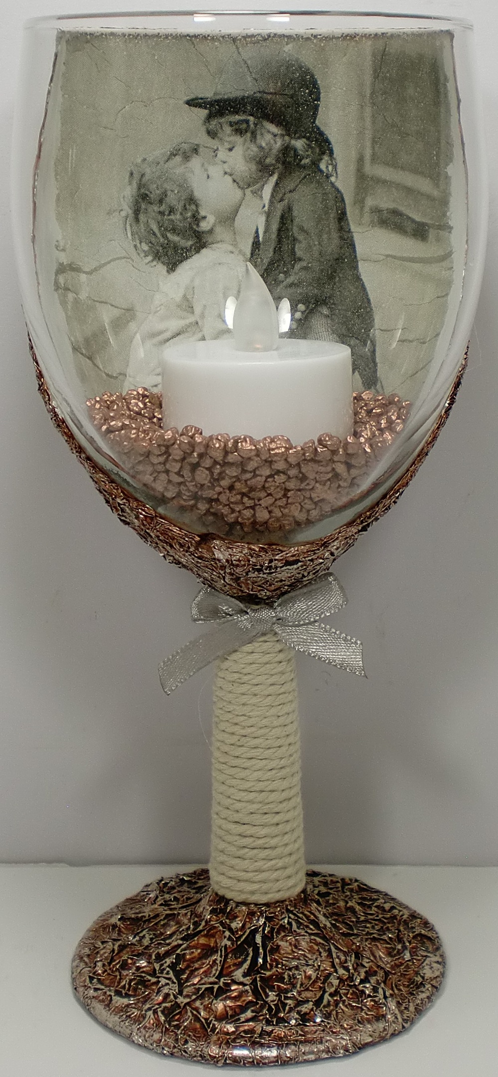 Ett vinglas dekorerat med olika detaljer.